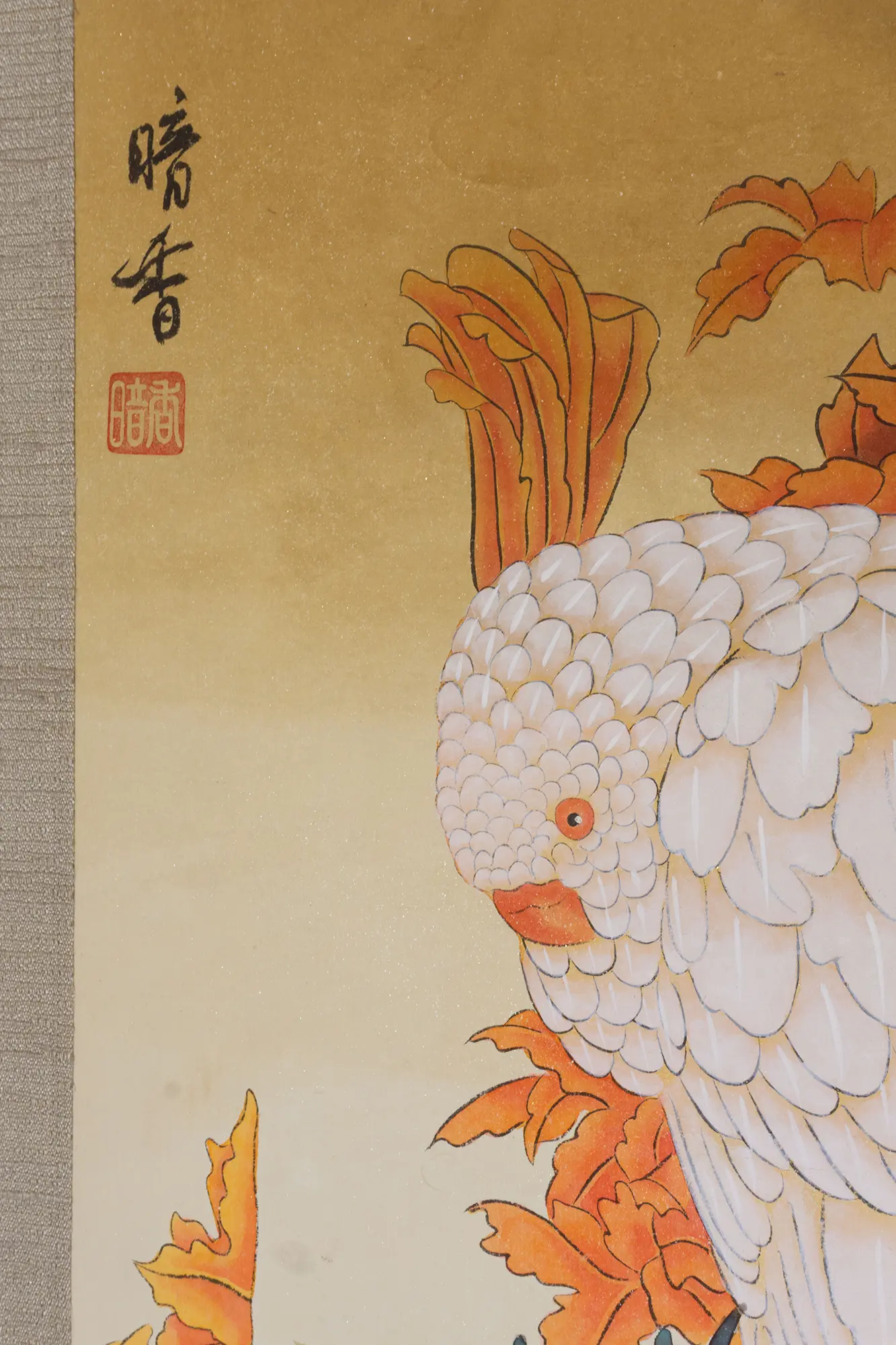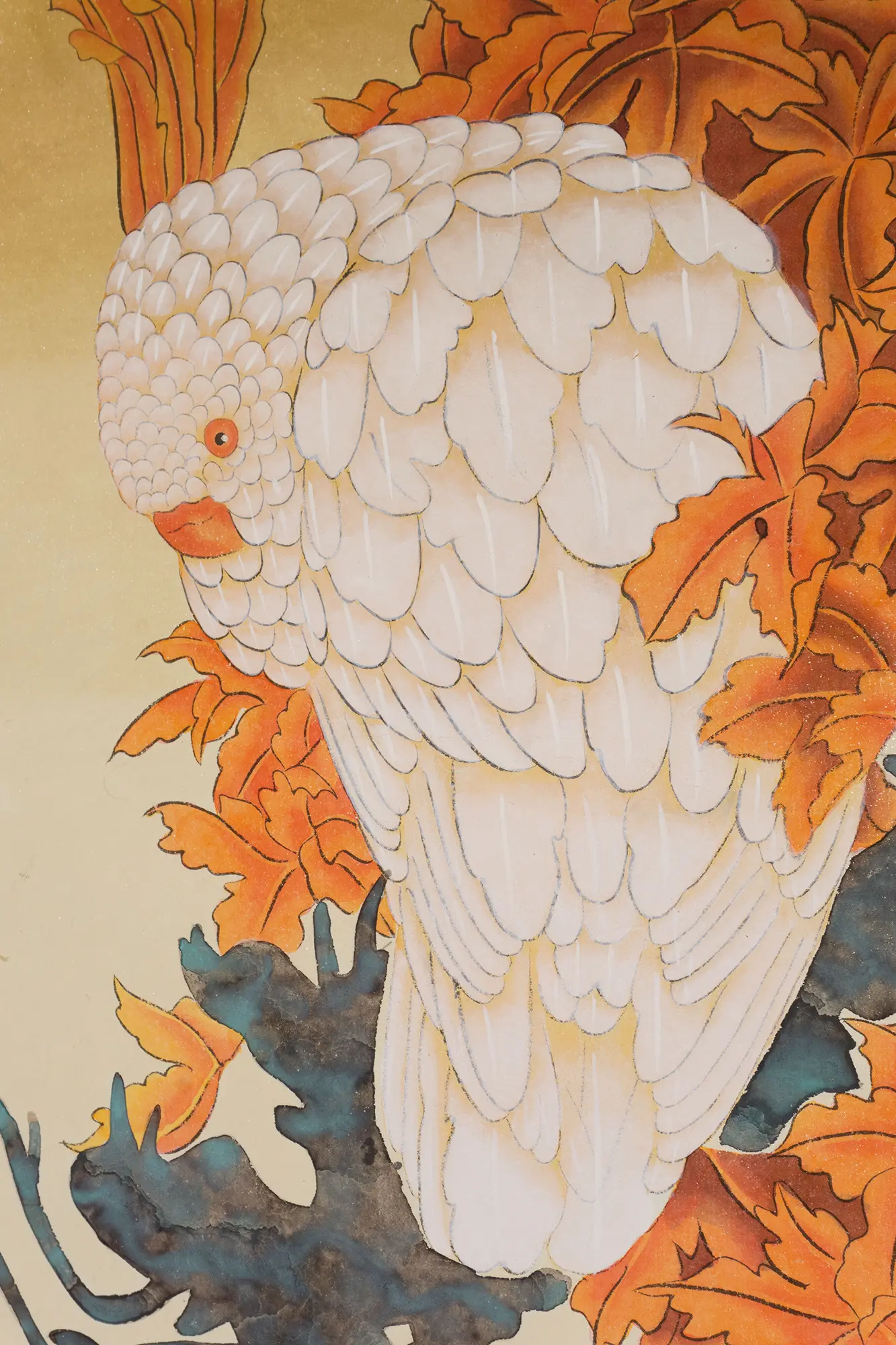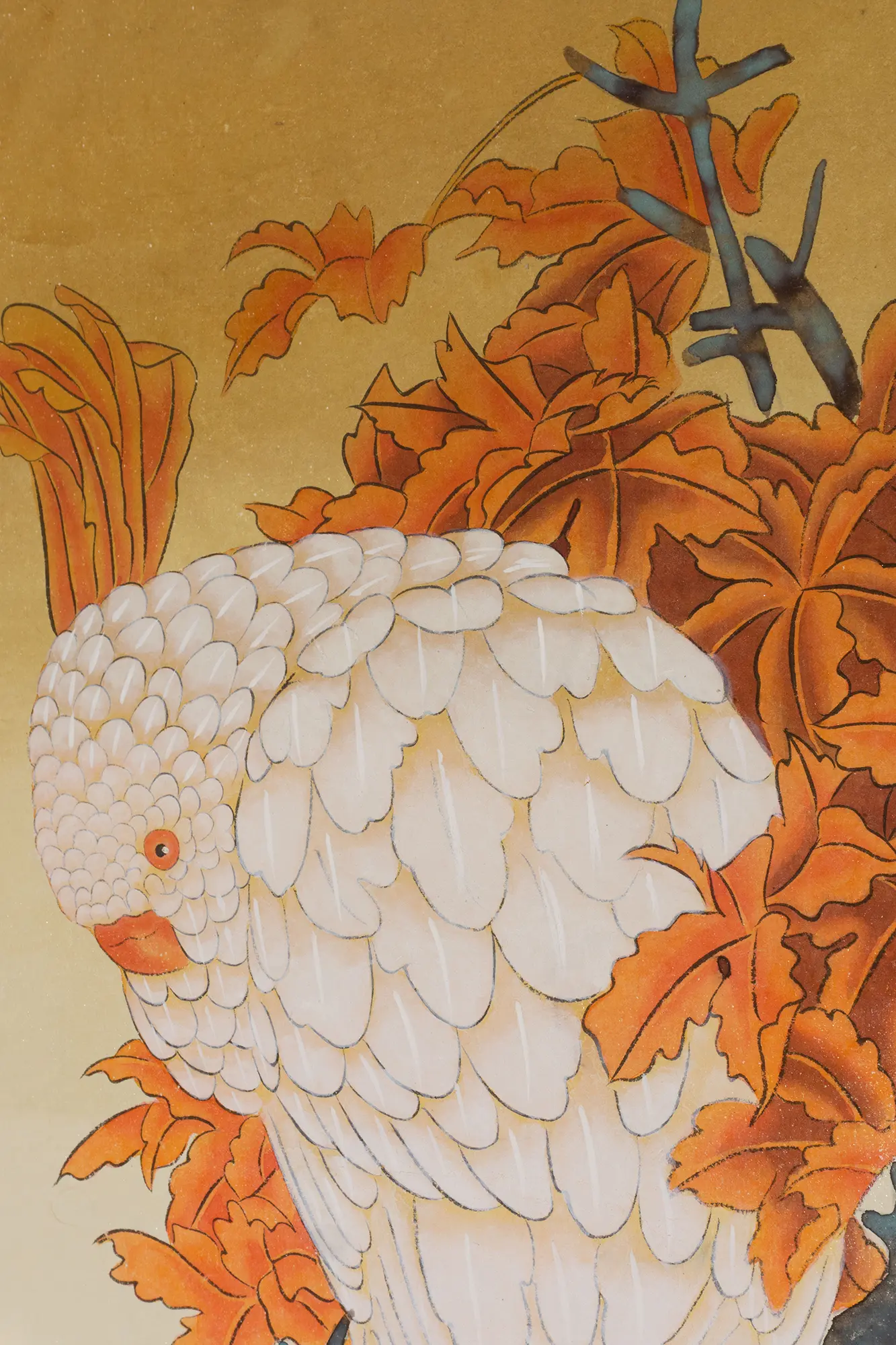 Dieses Kunstwerk ist ein chinesisches Vogel- und Blumenbild (bekannt als Huaniao-Hua), das einen weißen Kakadu zeigt, der zwischen herbstlich gefärbten Blättern sitzt.