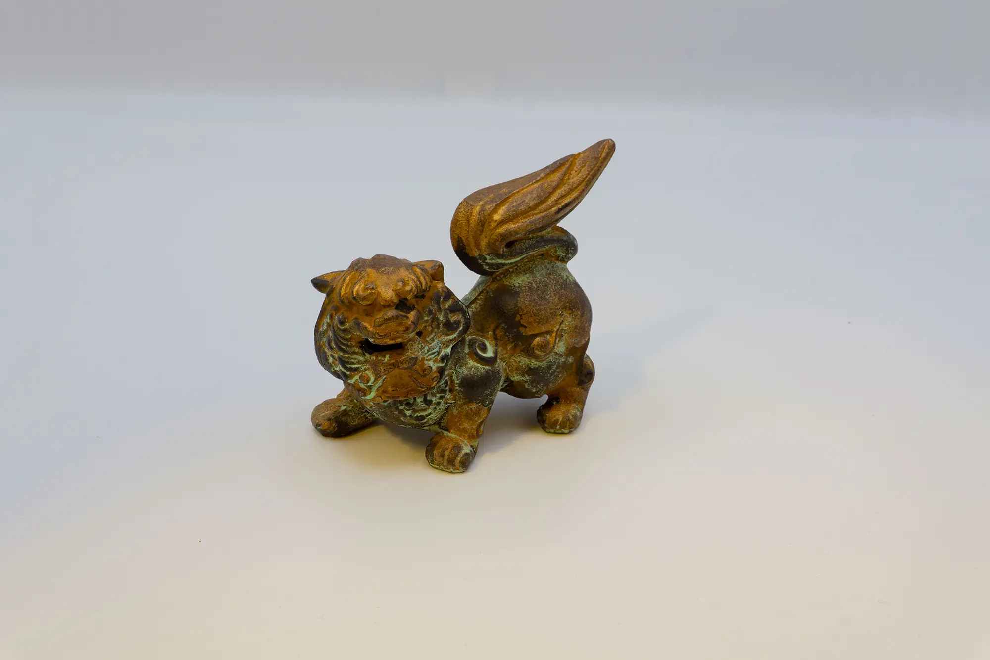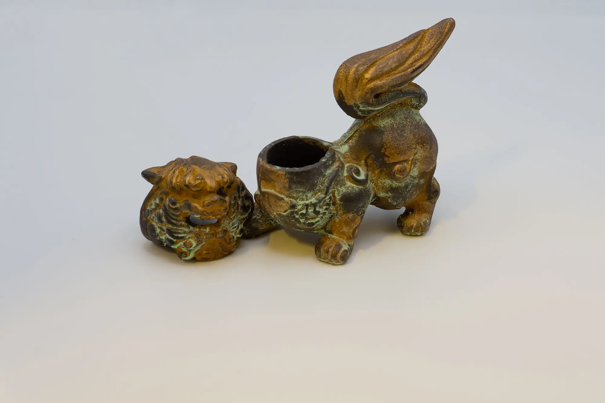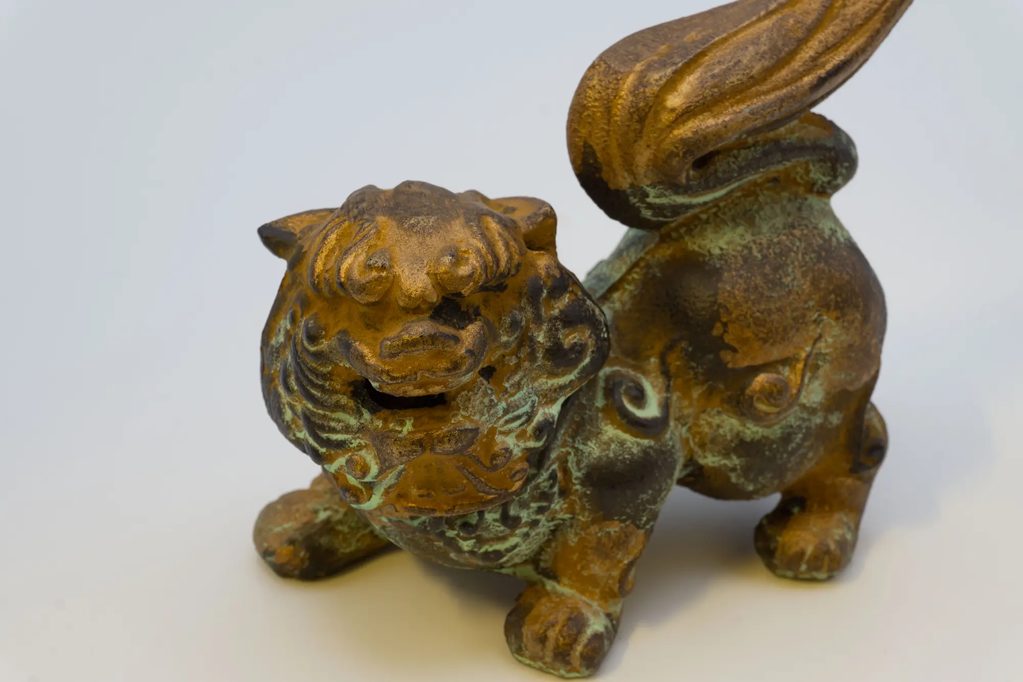 Japanischer Koma Inu (Shishi – Löwenhund) Räuchergefäß aus patinierter Bronze. Dieses Räuchergefäß, das traditionell zum Verbrennen von Weihrauch für religiöse Zeremonien verwendet wurde, ist dem Bild eines Wächterlöwen nachempfunden, dem mythische Schutzkräfte zugeschrieben werden und der mit Glück in Verbindung gebracht wird. Hergestellt vom renommierten Atelier Takaoka. Maße: 11 cm x 5 cm x 9 cm