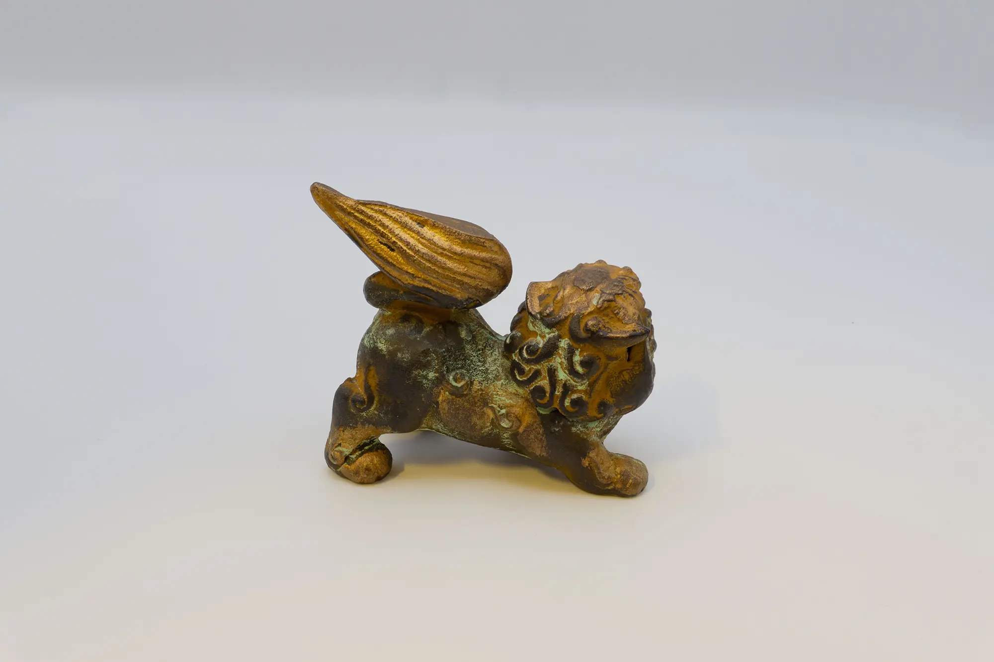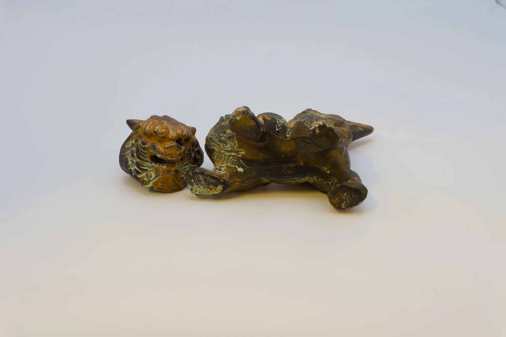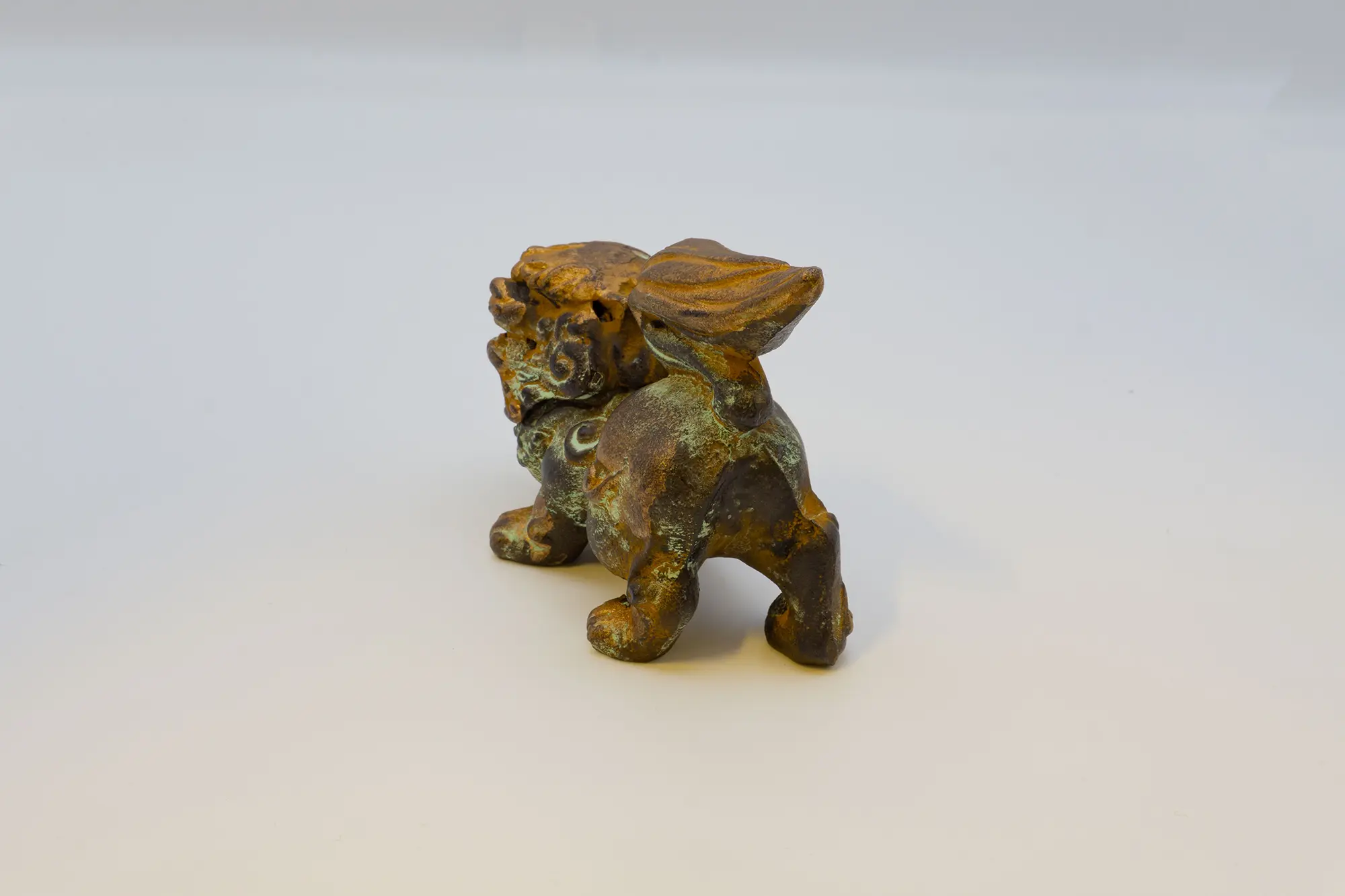 Japanischer Koma Inu (Shishi – Löwenhund) Räuchergefäß aus patinierter Bronze. Dieses Räuchergefäß, das traditionell zum Verbrennen von Weihrauch für religiöse Zeremonien verwendet wurde, ist dem Bild eines Wächterlöwen nachempfunden, dem mythische Schutzkräfte zugeschrieben werden und der mit Glück in Verbindung gebracht wird. Hergestellt vom renommierten Atelier Takaoka. Maße: 11 cm x 5 cm x 9 cm