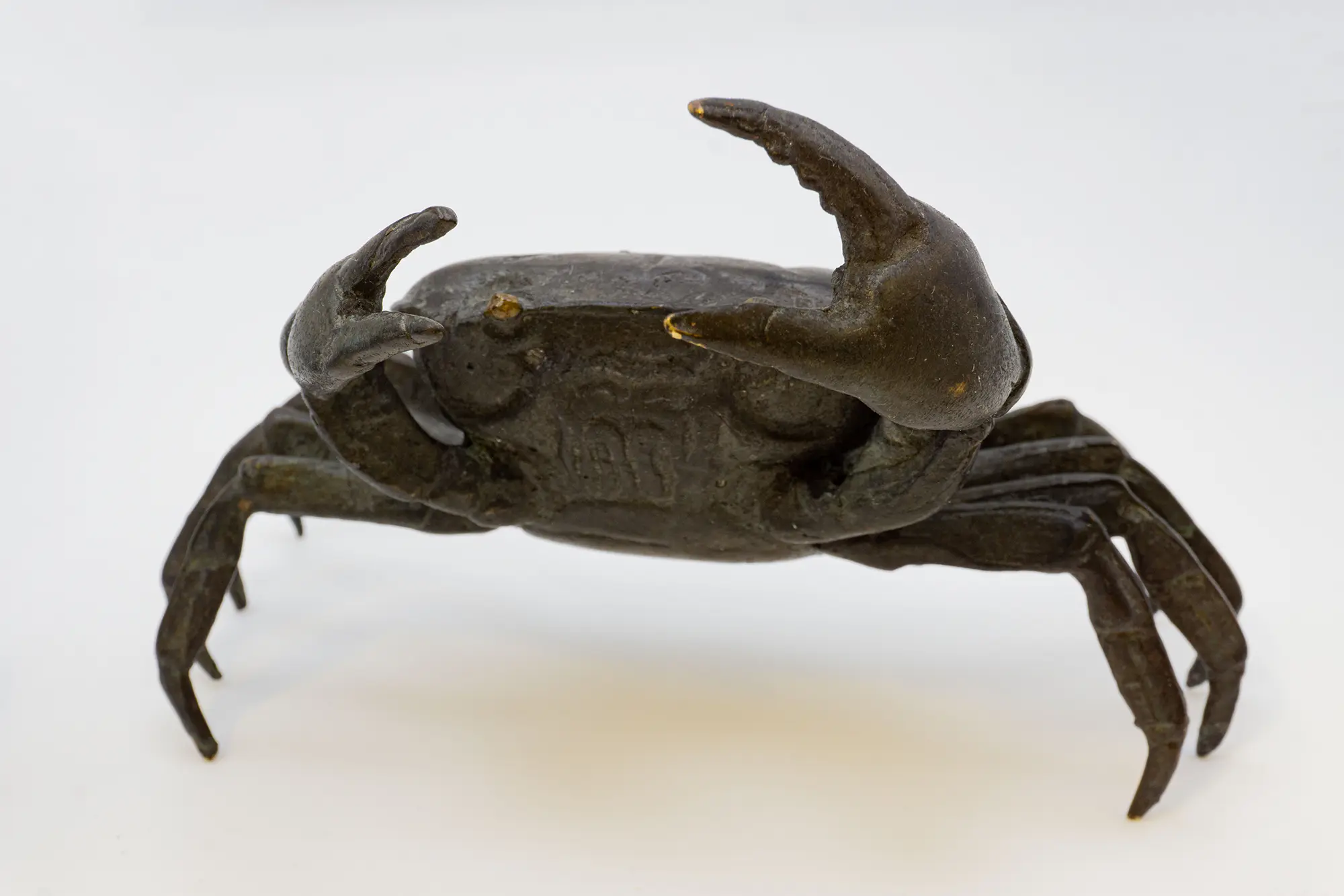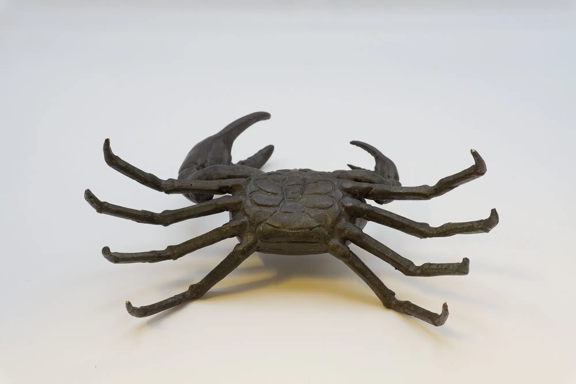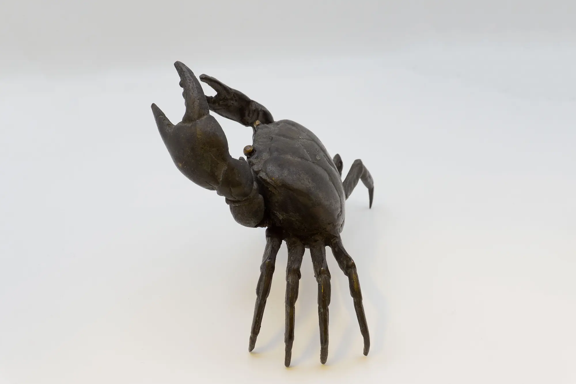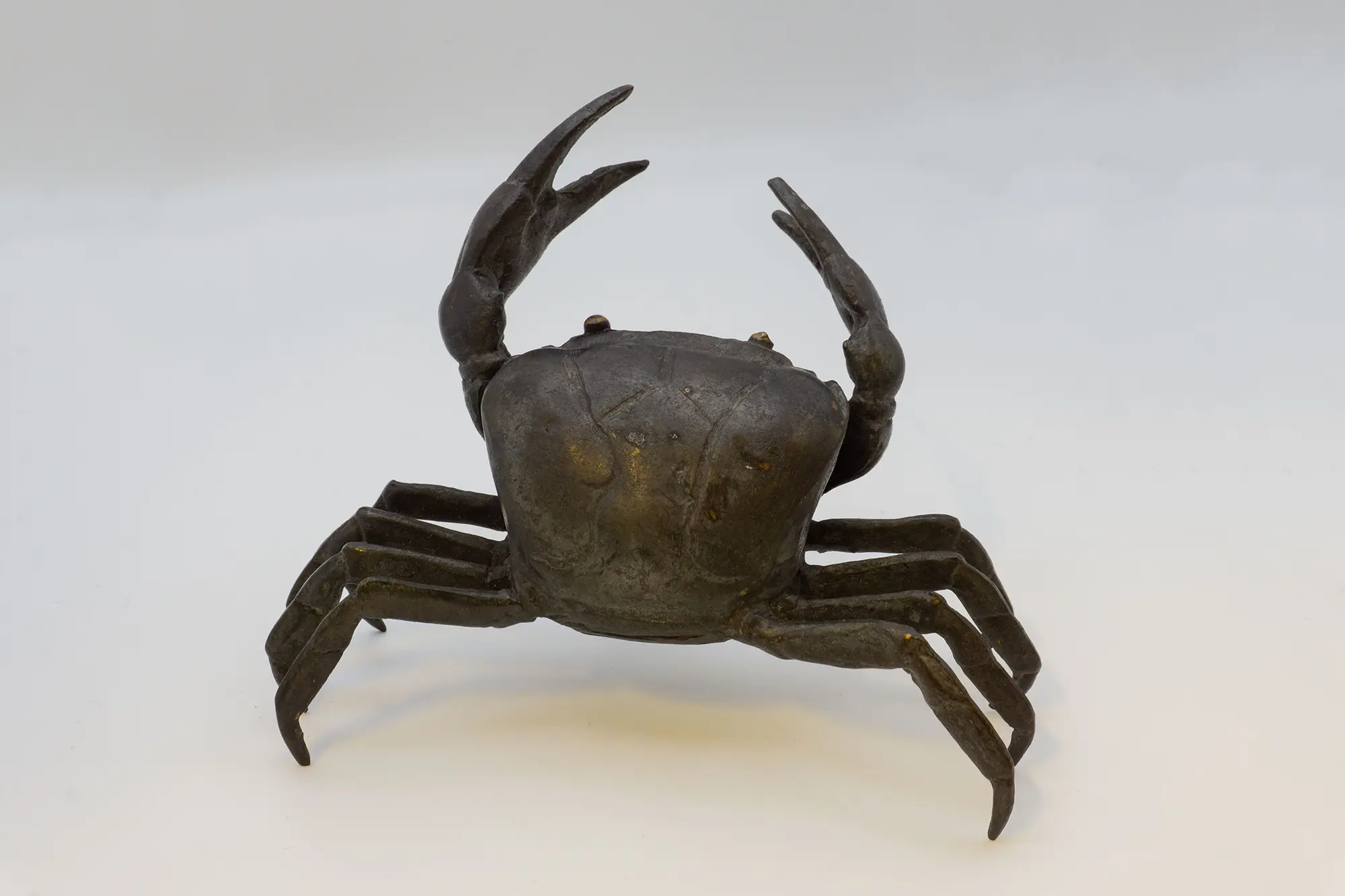 Una coppia di sculture in bronzo raffiguranti granchi, okimono, risalenti al periodo Meiji. I granchi sono riprodotti con dettagli realistici e, pur essendo simili, presentano caratteristiche uniche, in particolare i disegni sull'addome che distinguono il maschio dalla femmina. Queste sculture venivano originariamente create dagli armaioli quando la domanda di yoroi (un tipo di armatura tradizionale) diminuì. Ogni granchio pesa 450 grammi e misura circa 13 cm di lunghezza e altezza.