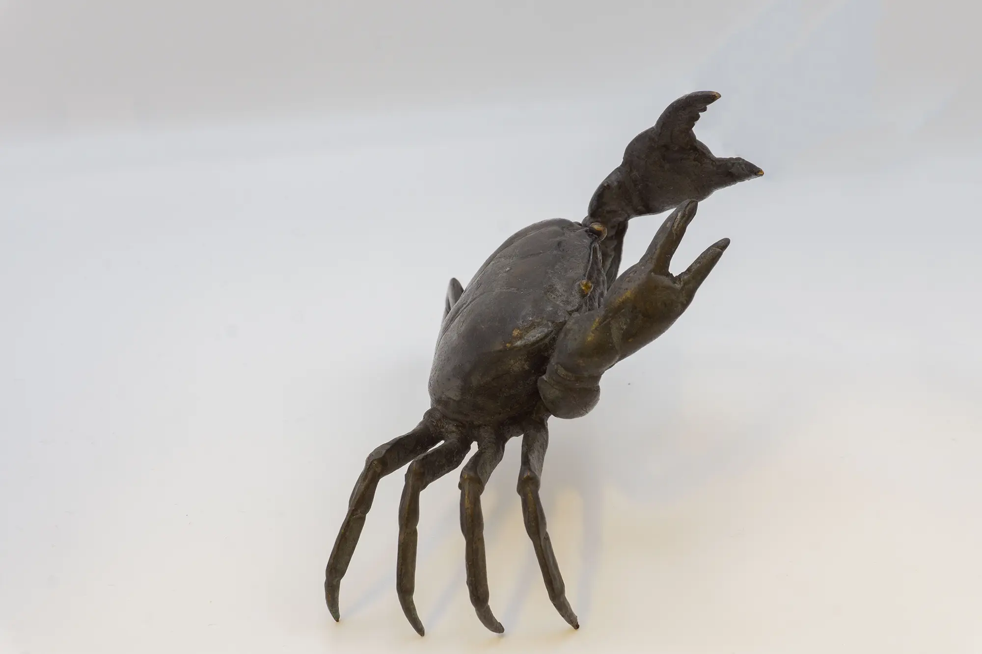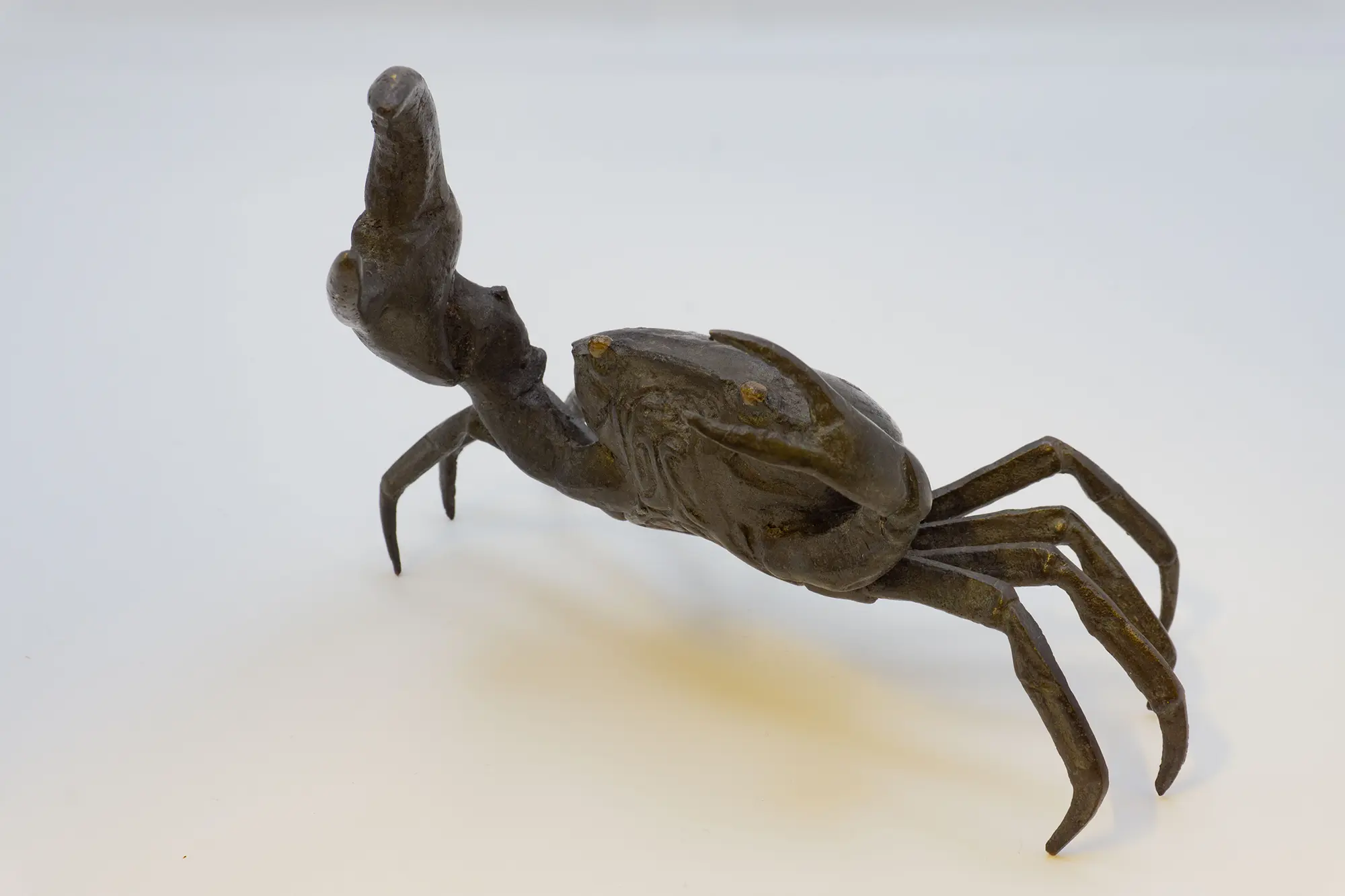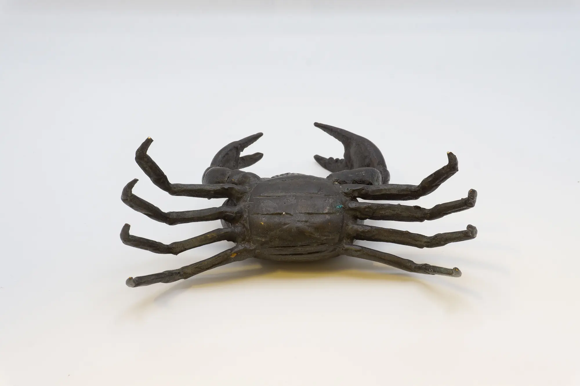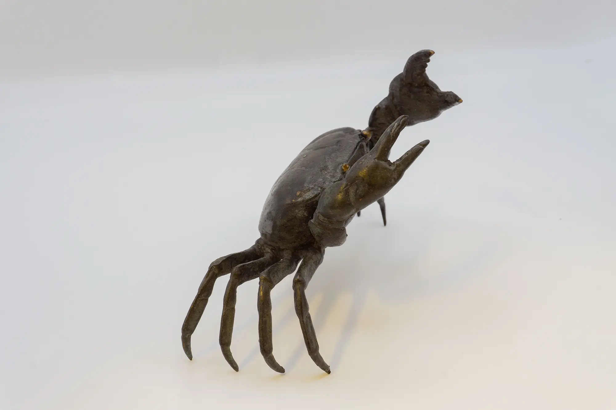 Una coppia di sculture in bronzo raffiguranti granchi, okimono, risalenti al periodo Meiji. I granchi sono riprodotti con dettagli realistici e, pur essendo simili, presentano caratteristiche uniche, in particolare i disegni sull'addome che distinguono il maschio dalla femmina. Queste sculture venivano originariamente create dagli armaioli quando la domanda di yoroi (un tipo di armatura tradizionale) diminuì. Ogni granchio pesa 450 grammi e misura circa 13 cm di lunghezza e altezza.