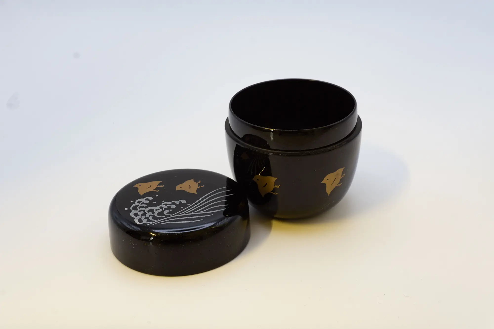 Tea caddy (natsume) in black urushi lacquer, XX Century, depicting golden birds above the waves. Traditional tea caddy used in japan to store tea, usually matcha, for daily use. The form is smooth and rounded, with a snug fitting lid, designed for both elegance and functionality. The minimalist aesthetic and natural beauty reflect the wabi-sabi principles at the heart of the tea tradition.