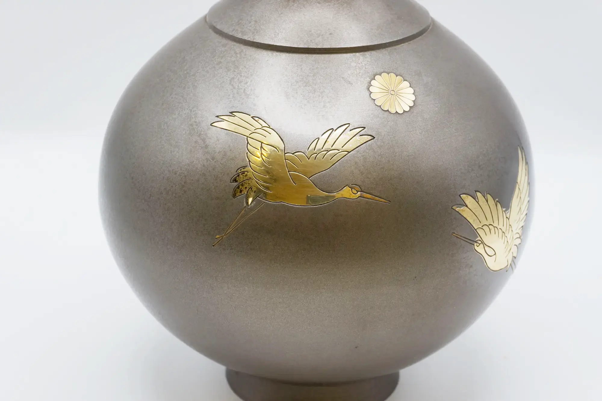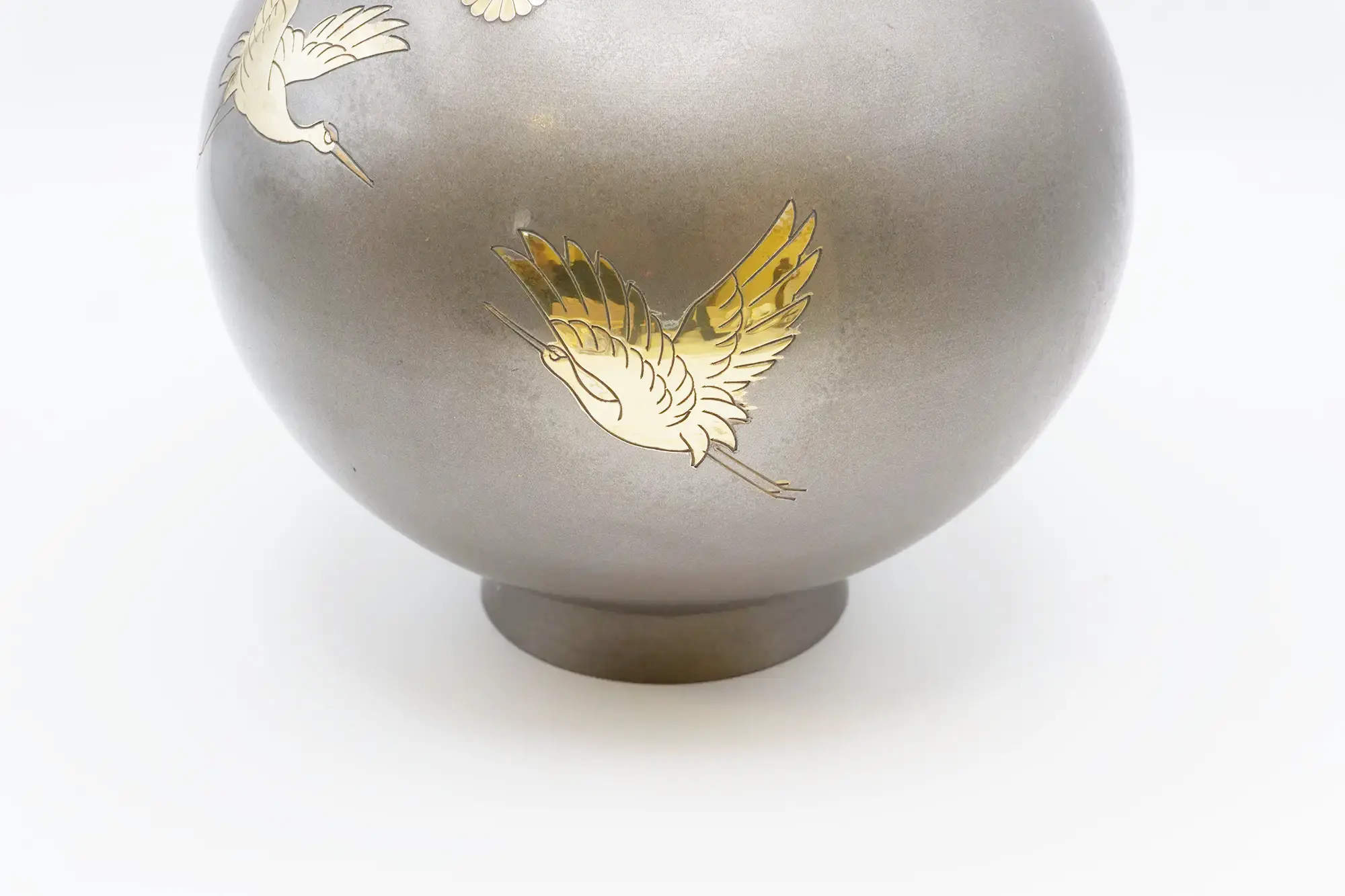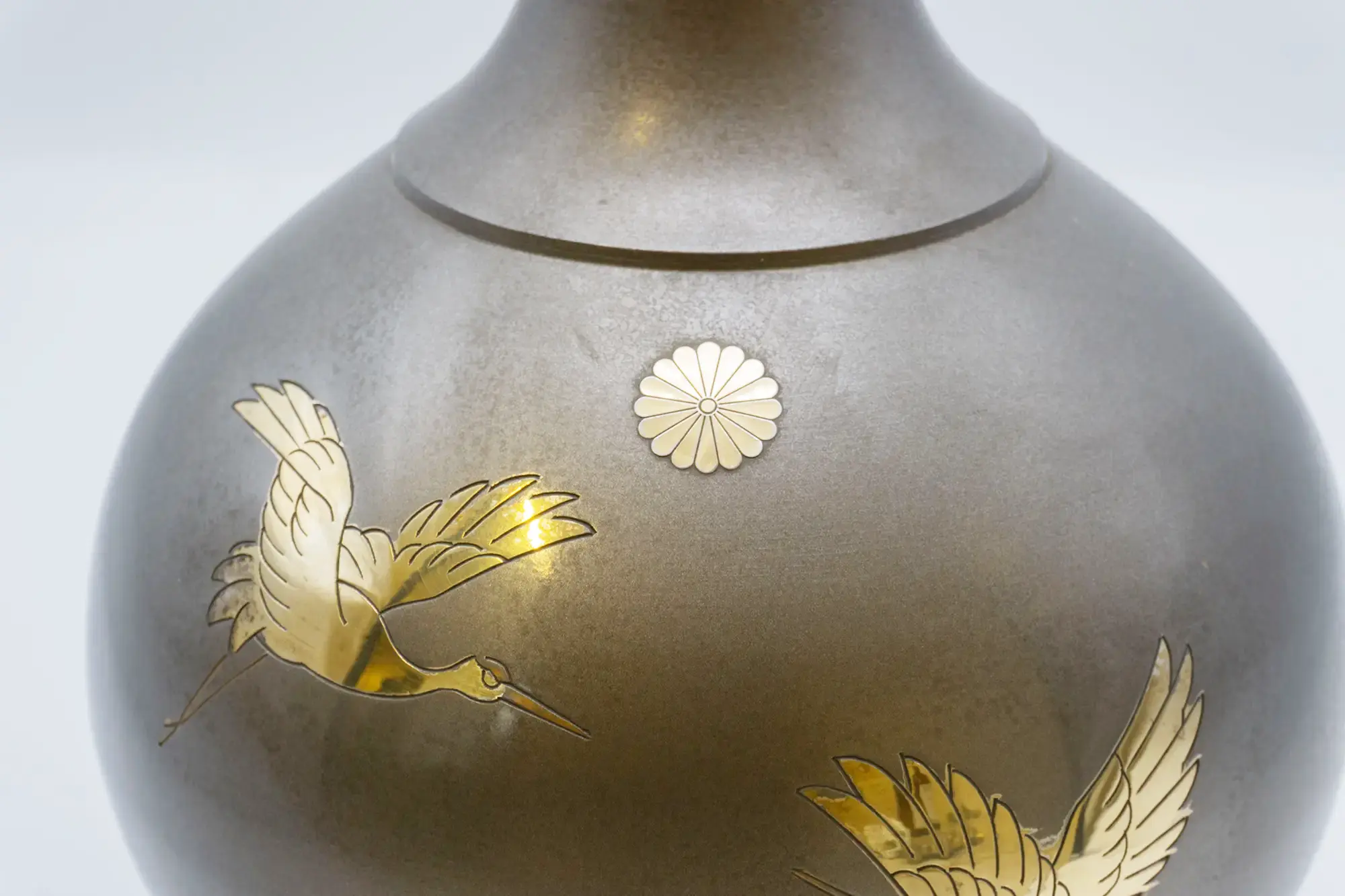 Bronze patinated vase from the Meiji period featuring inlaid decorations of golden flying cranes and silver imperial chrysanthemum crest. In Japanese culture cranes are a symbol of longevity, pared here with the imperial kamon. With maker’s seal.